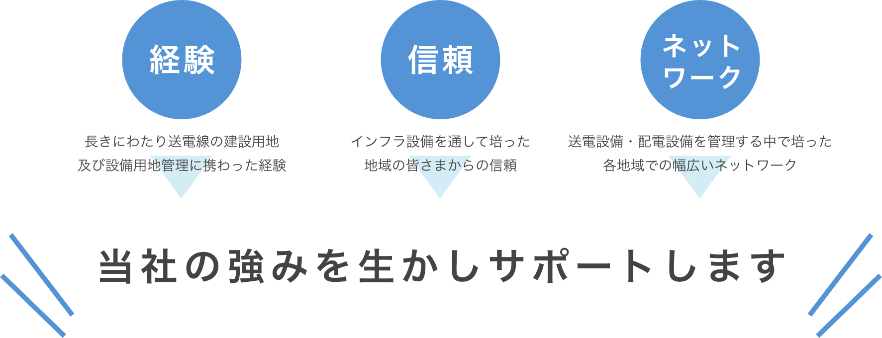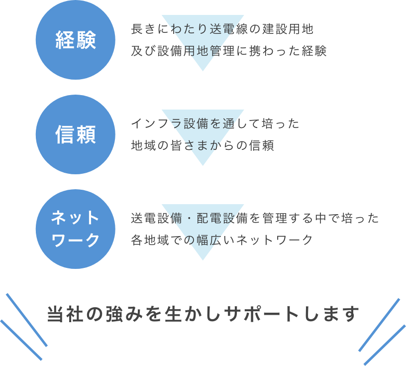 電力設備用地の取得・管理事業、一般土地取得・管理・運用事業、測量、補償コンサルタント |