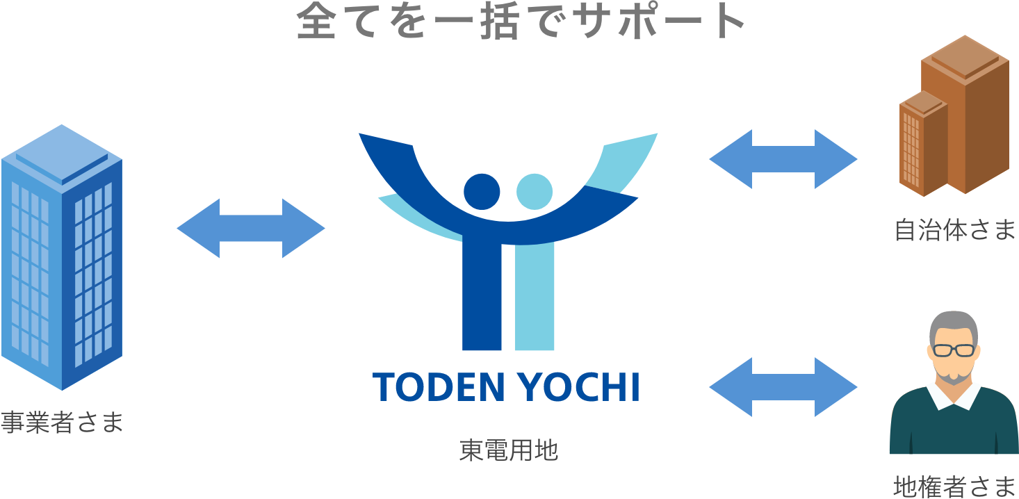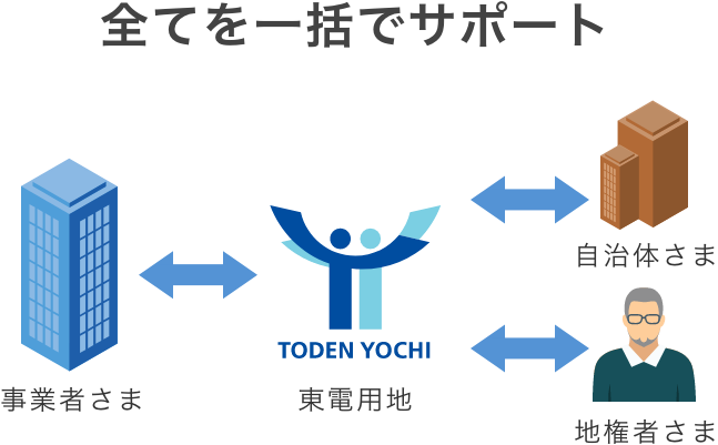 東電用地では、電力用地の取得を通じて培った交渉スキルを活かして、事業者さまの用地業務のサポートを積極的に推進しています。またグループ所有の土地に関するノウハウを活用し、土地活用に関するご相談も承っています。