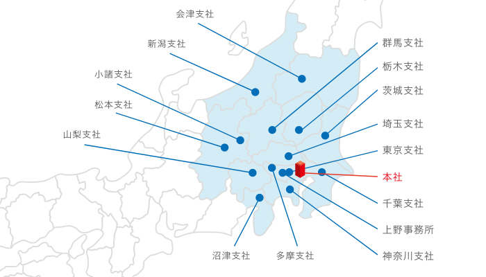 関東地方一都六県、山梨県、静岡県、福島県、長野県、新潟県に事務所を保有しており、