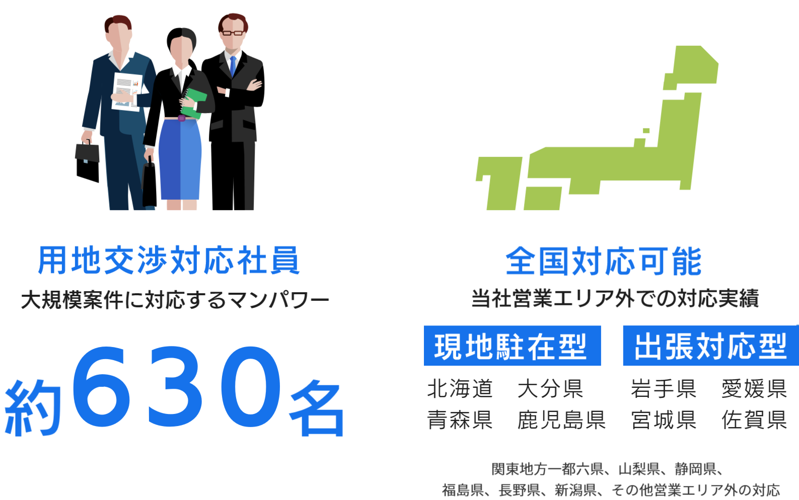電力用地交渉に関する確かな実績と専門的なスキルを持つ社員約630名が在籍。