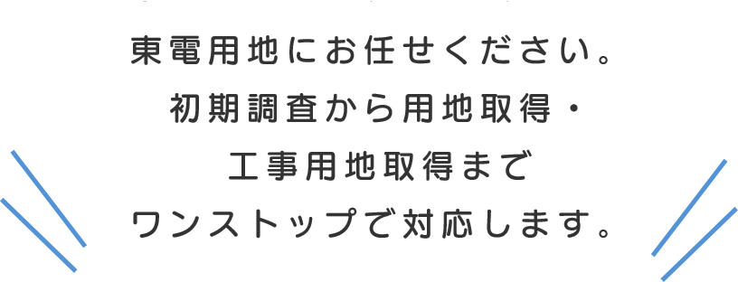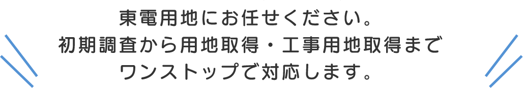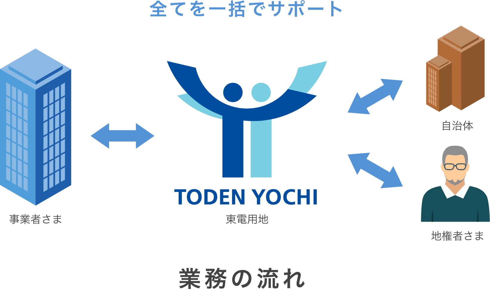 東電⽤地は電⼒⽤地に関する豊富なノウハウと⼈材を活⽤し、再エネ用地に関する初期段階の調査から地域の合意形成(利害関係者との調整を含む)、交渉、許認可申請、契約更新等の⽤地管理まで、⼀貫してサポートします。