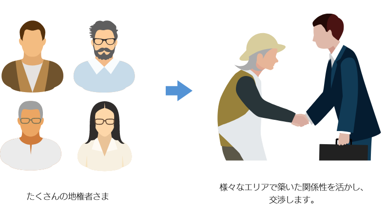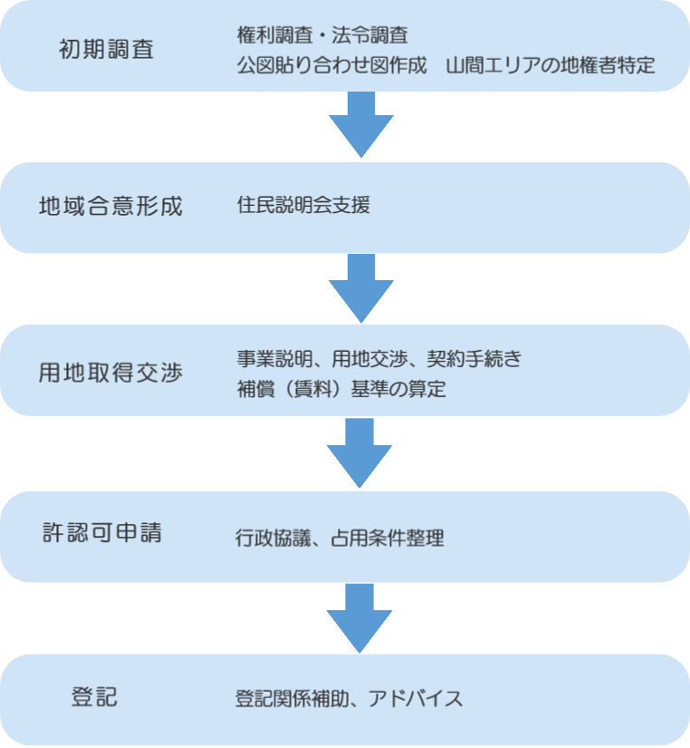 地権者探し等の初期調査から、地域の合意形成、実際の用地交渉、さらに自治体への許認可申請まで用地取得に必要な一連の対応をご支援します。