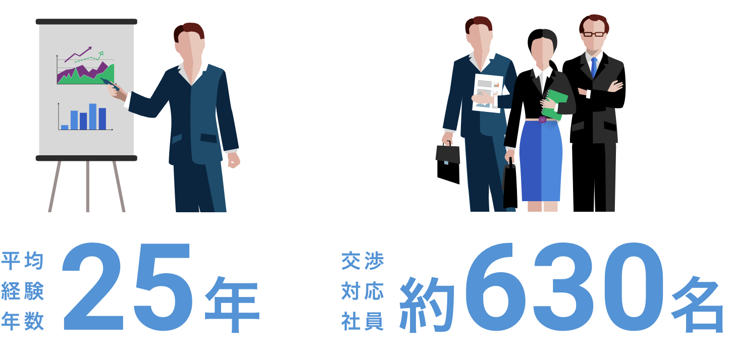 平均25年の経験を持つ用地交渉対応社員約630名が在籍。